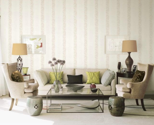 Lựa chọn loại giấy tông màu sáng sẽ làm đánh lừa thị giác giúp không gian trông rộng rãi và thoáng đăng hơn. Không nên lựa chọn giấy trang trí có quá nhiều hoa văn, họa tiết, điều này không những mất đi điểm nhấn, mà nó còn làm phòng khách phai nhòa đi sự tinh tế.
