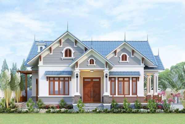 Kết cấu mái thái tạo điểm nhấn khi kết hợp với phong cách thiết kế tinh tế khi sử dụng hệ phào chỉ ngoại thất màu xanh lam và gỗ ấn tượng. Cảnh quan sân vườn đẹp với cây cảnh, hoa và bãi cỏ.