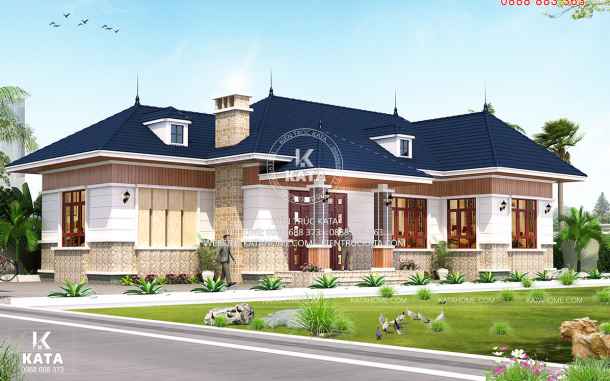 Ngoài ra, mẫu biệt thự 1 tầng 4 phòng ngủ cũng rất thích hợp cho những gia chủ muốn tìm kiếm một ngôi nhà mới, trẻ trung nhưng không kém phần sang trọng và lịch lãm cho ngôi nhà mơ ước của mình. Ấn tượng là hệ thống mái thái màu xanh than mang đến cảm giác ấm cúng và sang trọng phù hợp với sở thích cũng như mệnh của gia chủ. Phần mái được thiết kế theo dạng xòe chữ A tạo dáng cao cân đối chiều cao và chiều rộng của ngôi nhà, tạo lớp đệm không khí không hấp thụ nhiệt từ mái tôn lên làm mát mùa hè và ấm áp cho mùa đông.